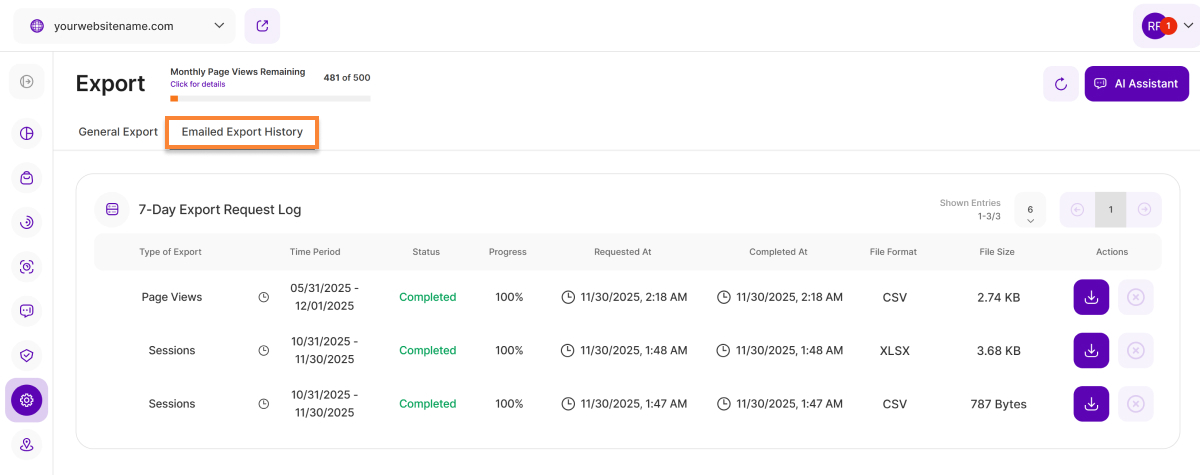 - Choose Your Data: Select whether you want to export Sessions data or Page Views (formerly "Visits") history, depending on your specific needs.