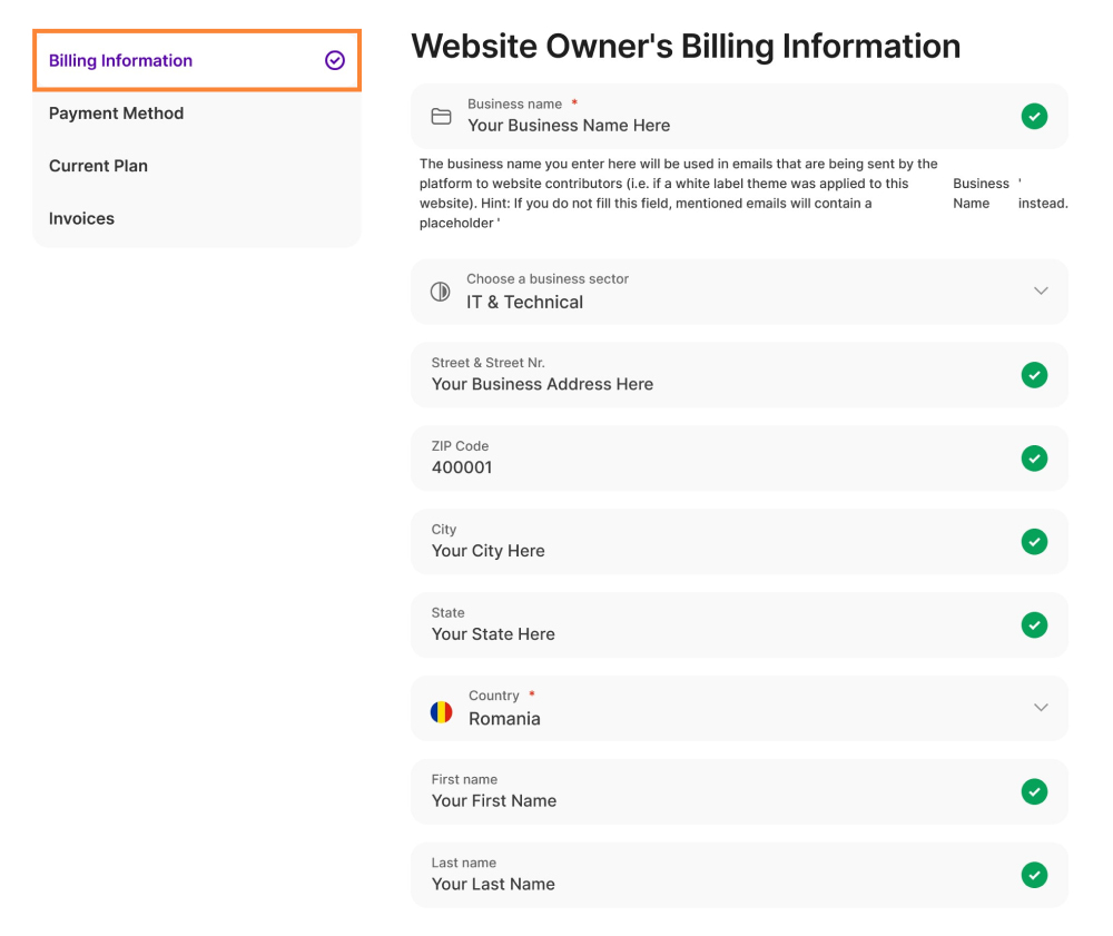The information you add will be used and shown on the automatically generated billing statements for this website.
