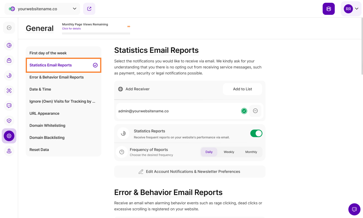Set up email adddresses to which error alert reports can be sent when alarming behavior events (ABEs) are detected on your website, such as rage clicks, dead clicks, or excessive scrolling.