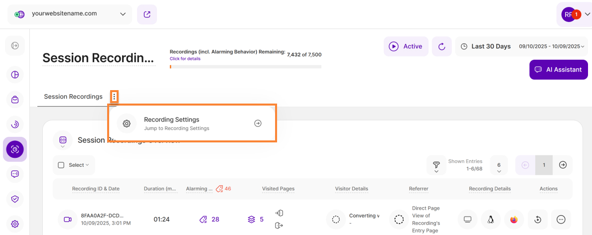 The Session Recordings feature is now active and will begin collecting new visitor data according to your specified settings.