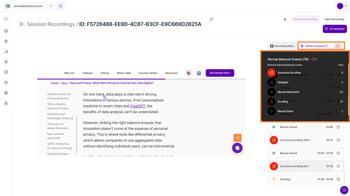 The Session Recordings feature enables you to actually see what your visitors are doing on your website. You can view video recordings of visitor's actions during their session, clearly illustrating where clicks occurred, content viewing patterns, and overall actions taken. Analyzing this valuable information empowers you to optimize your website for a better visitor experience.