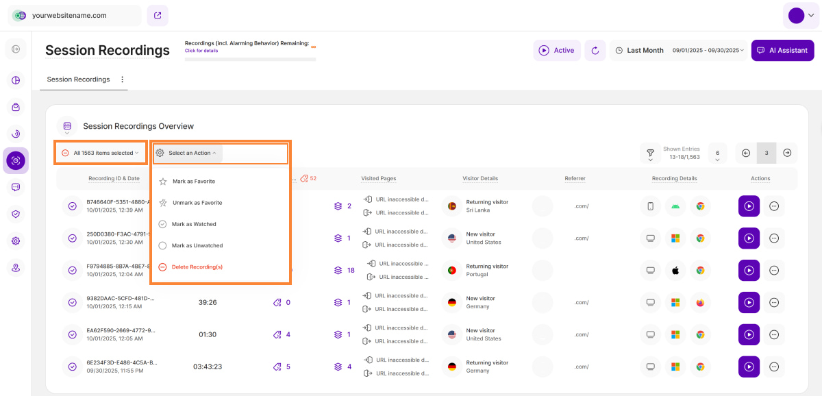 The Bulk Action feature in the Session Recordings Overview lets you manage multiple session recordings simultaneously.
