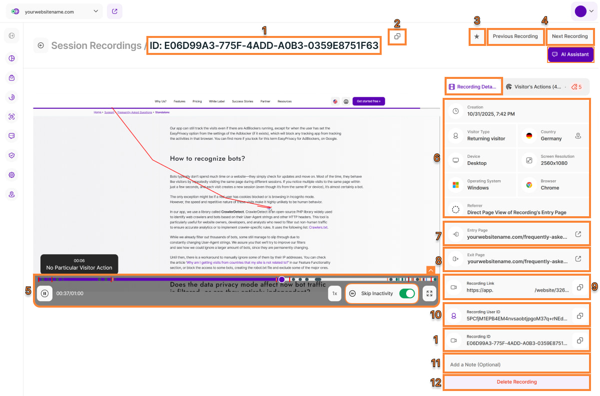 The majority of the screen is dedicated to showcasing the Session Recording, offering a detailed perspective. Now, let's uncover the remaining features on this page. Within this section, you have the option to choose between two views, Recording Details and Visitor's Actions. Keep reading to discover more about these views!