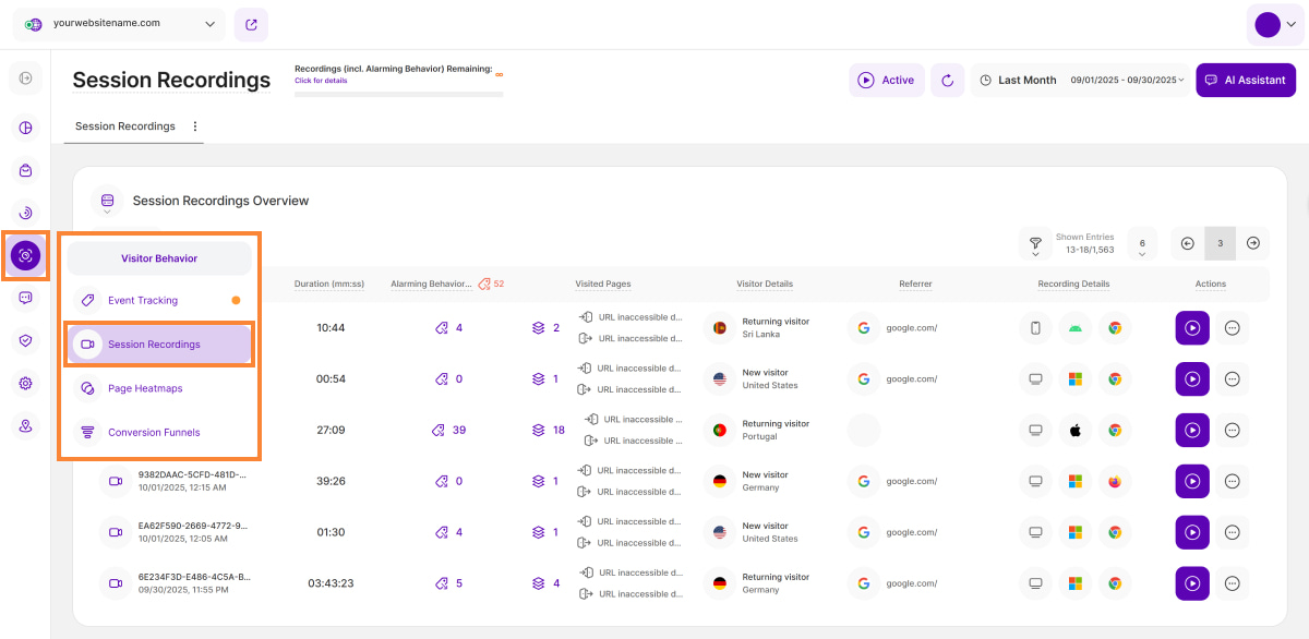 The Session Recordings Overview provides a comprehensive view of your visitors' session recordings, offering valuable insights into how they interact with your website. Each row in the table represents a visitor's session recording, encapsulating their interactions and details.