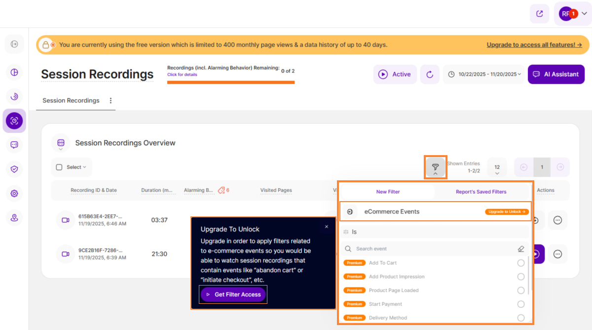| Funnel Filter | This filter isolates recordings where the visitor failed to proceed through a defined conversion path, showing the critical moment visitors quit a key goal. |