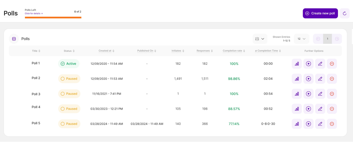 As described, the overview tables for created surveys and polls are somehow identical. You will see the following columns (from left to right):