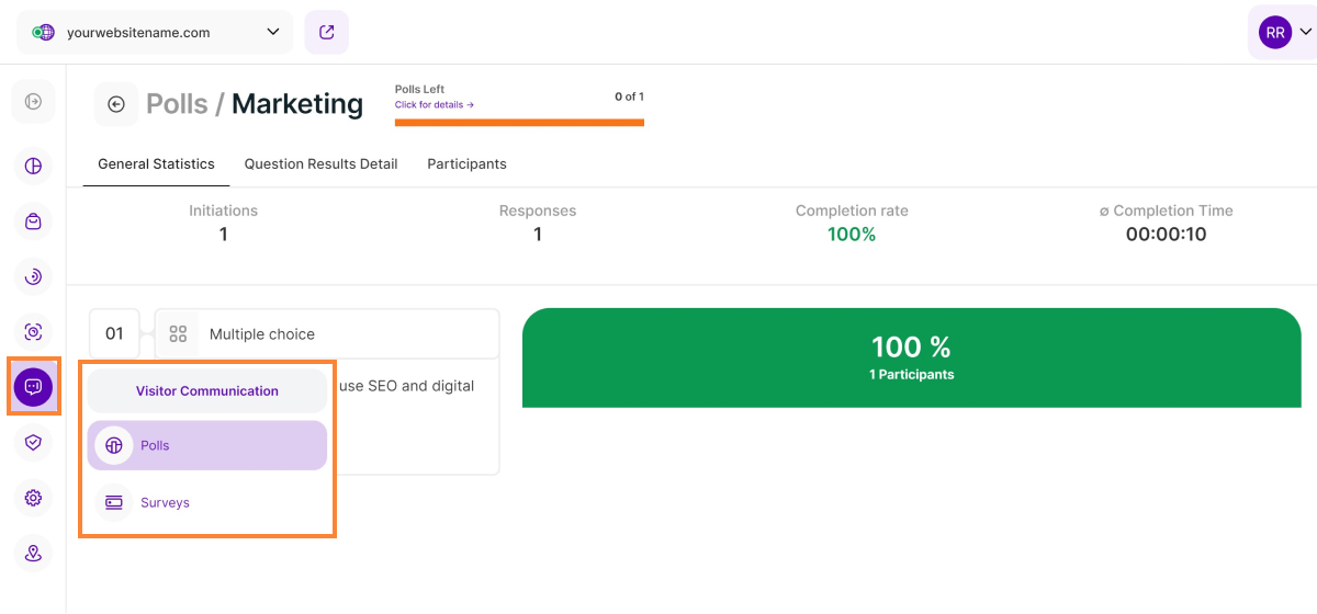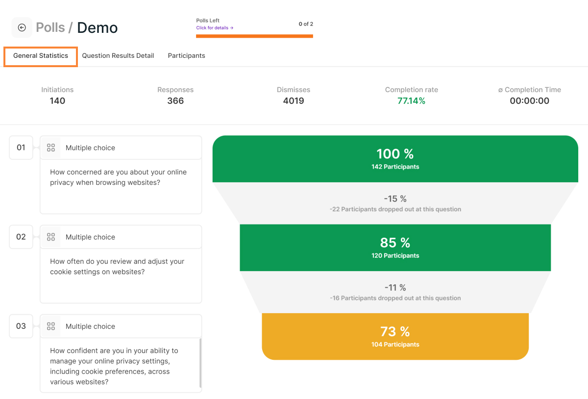 7. Completion Rate: The ratio of participants that finished all questions of a poll/survey in comparison to the amount of people that replied to at least one question. Hint: You can also check each participant's completion rate individually within the participants table.
