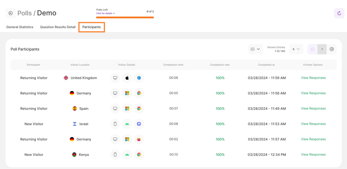 The last tab in the statistics section of each poll provides you with precise information about the participants who have initiated/submitted the poll.