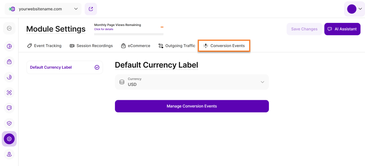 Within this section of the Module Settings, you can configure the default currency for all conversion events. A comprehensive guide on this topic is available in our Conversion Events Settings article.