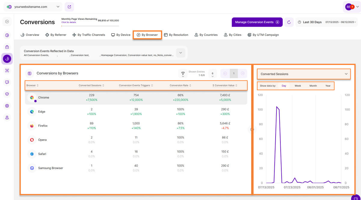 3. Conversion Events Triggers: This column displays how many triggers of conversion events were generated by sessions visiting your website via a specific browser in the selected time period.