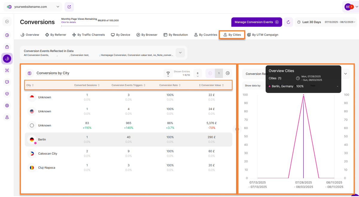 4. Conversion Rate: The conversion rate shows you what percentage of all sessions that visited your website via a specific city in a selected time period have triggered at least one conversion event.