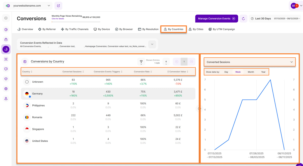 3. Conversion Events Triggers: This column displays how many triggers of conversion events were generated by sessions visiting your website via a specific country in the selected time period.