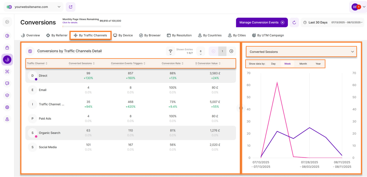 3. Conversion Events Triggers: This column displays how many triggers of conversion events were generated by sessions visiting your website via a specific traffic channel in the selected time period.