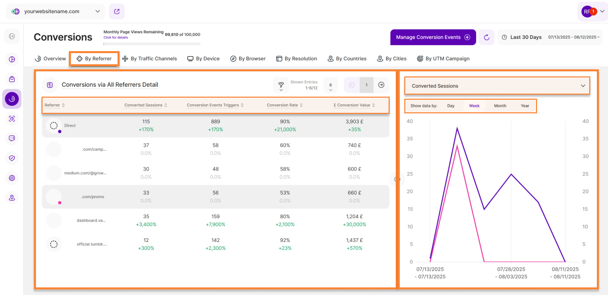 3. Conversion Events Triggers: This column displays how many triggers of conversion events were generated by sessions visiting your website via a specific referrer in the selected time period.