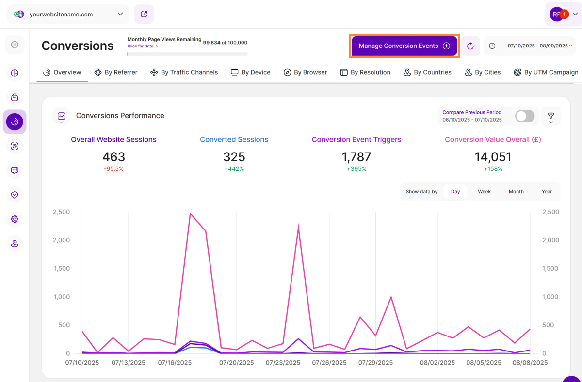 Start by defining your conversion events so you can begin seeing data. To do this, click the Manage Conversion Events button in the top right.