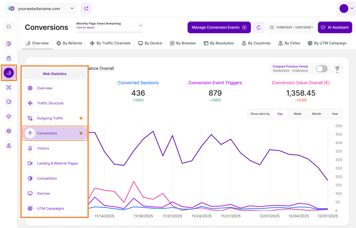 The Web Statistics module has a new addition we're excited to introduce: Conversions. The Conversions submodule will provide you with all the information you need regarding your individually defined conversion events. You can track and analyze specific events that are most important to your business, such as a successful purchase, a form submission, or a newsletter sign-up. This gives you the insights to effectively measure success, identify opportunities, and optimize your entire strategy.