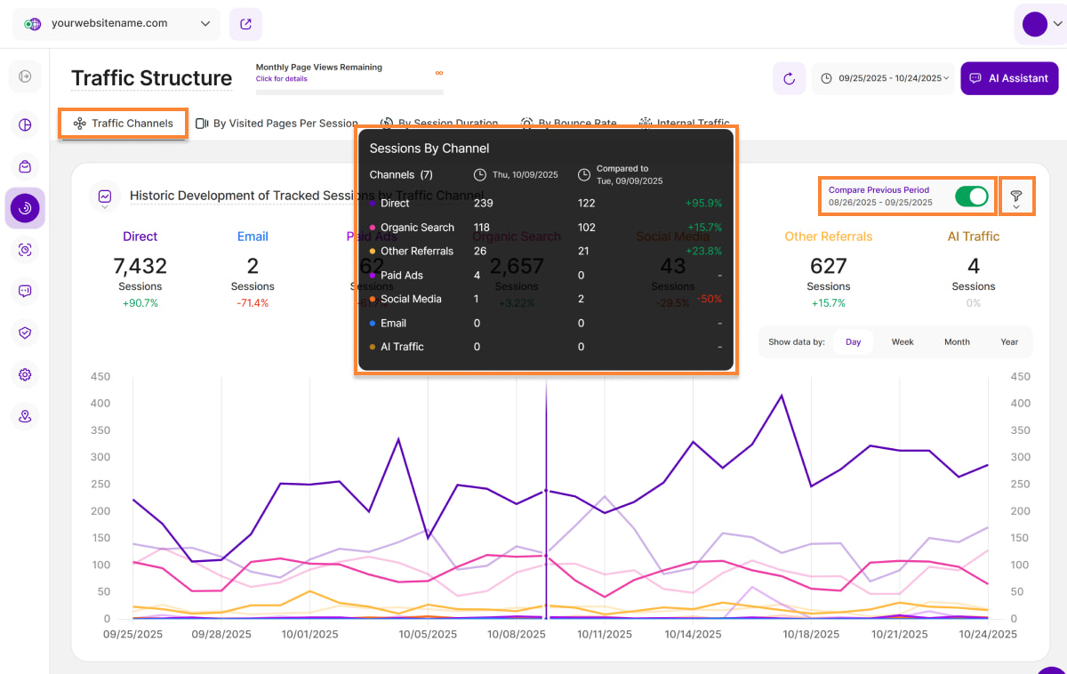 With a foundational understanding of your web traffic channels, you can now analyze traffic share trends by source. Each tab within the Traffic Structure submodule focuses on a particular aspect of the Historic Development of Tracked Sessions by Traffic Channel. The contained report blocks visualize how Key Performance Indicators (KPIs) have evolved over the chosen timeframe, segmented by traffic channel.
