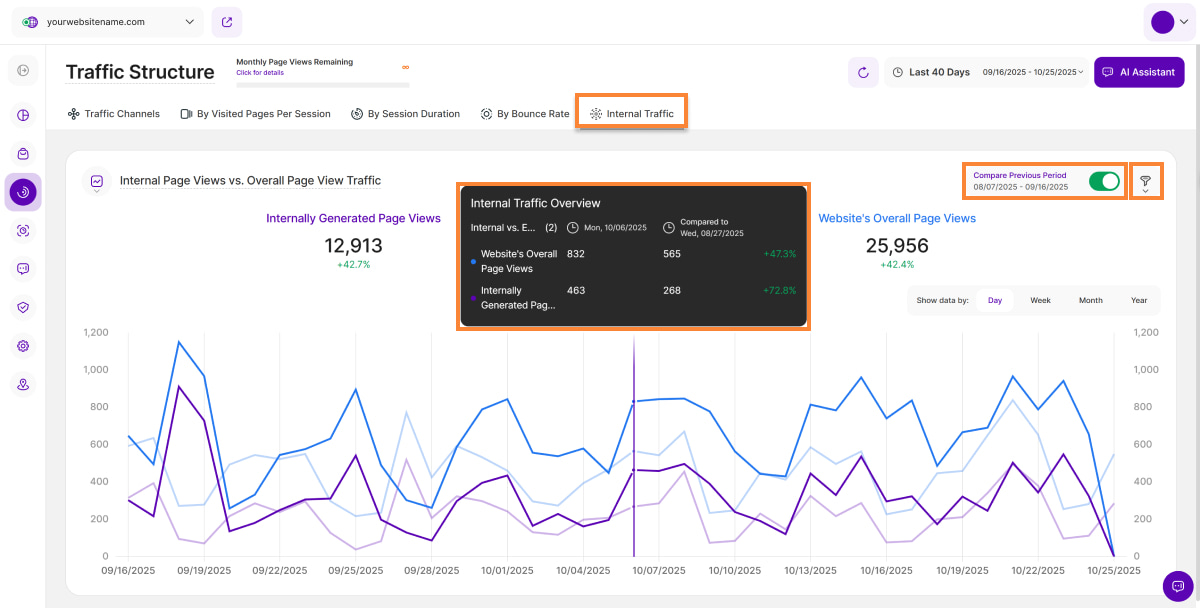 The graph visually displays the proportion of page views, enabling historical comparison of traffic from internally generated page views versus the website’s overall page views. Select both options to view overall trends or isolate a single source for focused analysis.