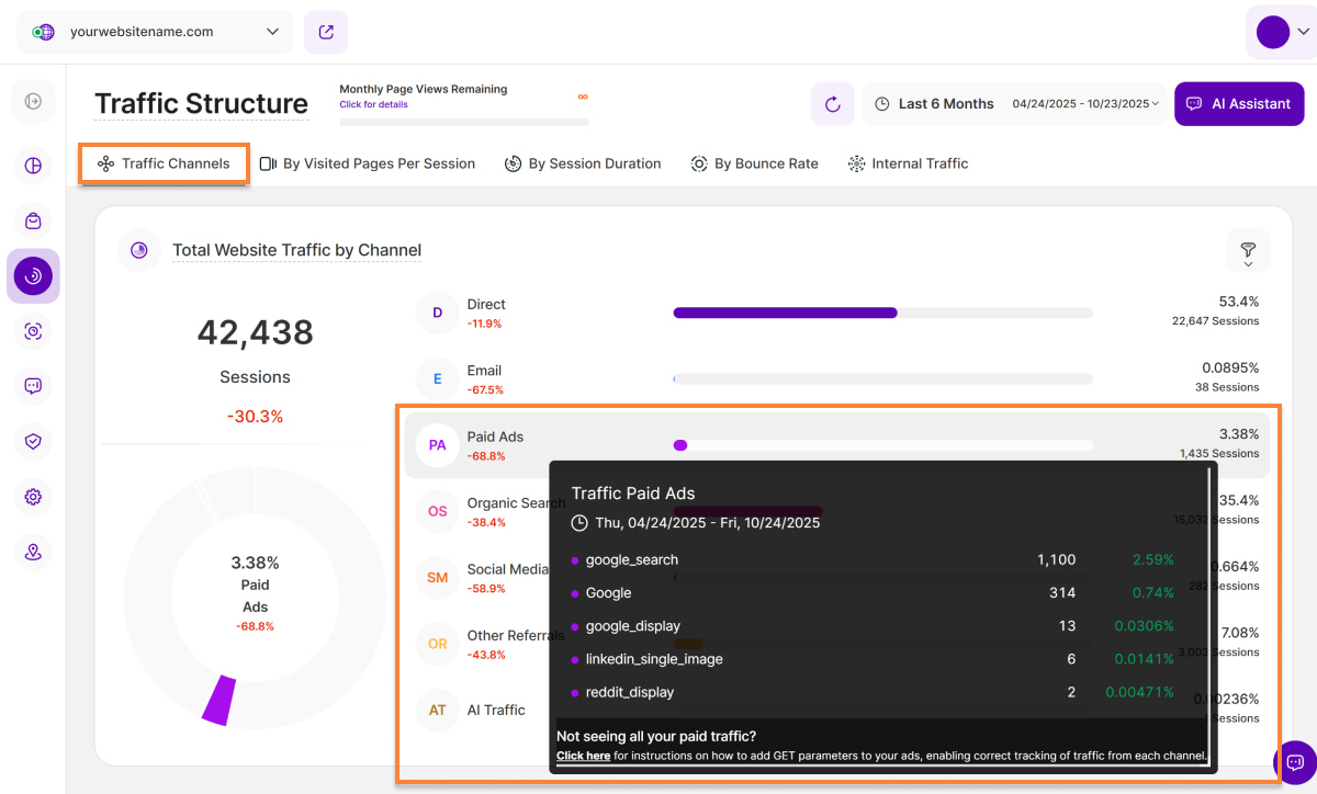 If you're not seeing all your paid traffic, click on the "Paid Ads" section to open the tooltip. Then, click the "Click here" link within the tooltip to learn how adding GET parameters to your paid ads can help you categorize them more effectively and ensure more accurate traffic data.