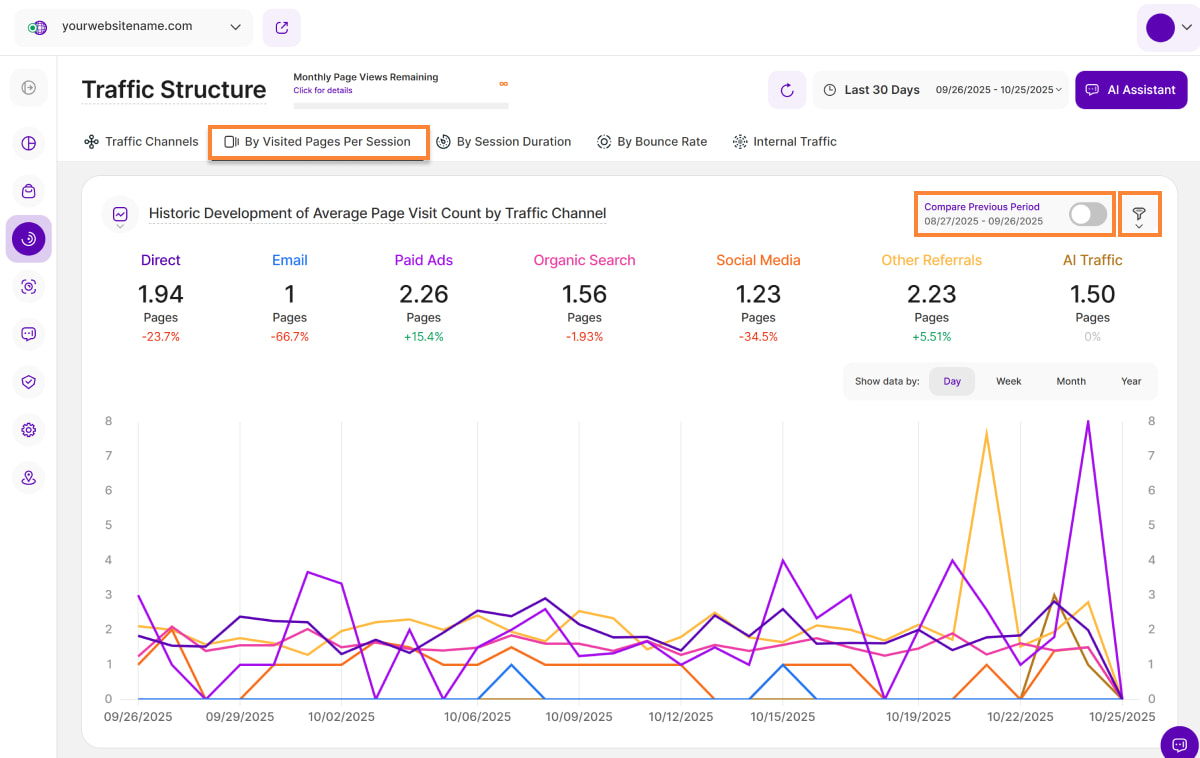 Now that you've explored your traffic sources, delve into engagement with the Visited Pages Per Session metric. This subtab is divided into two sections which will unlock insights into how visitors interact with your content: