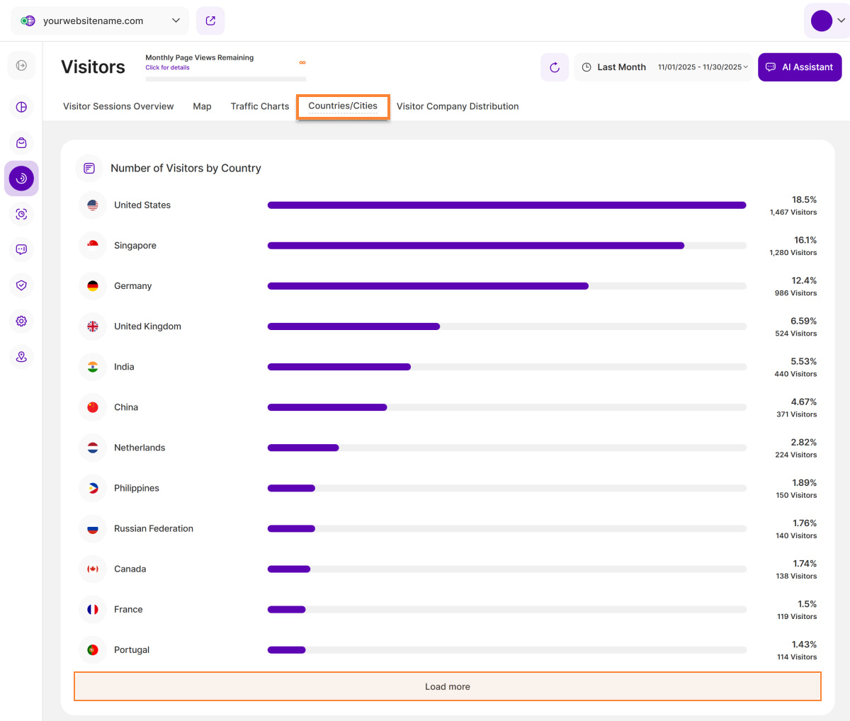 The first report block provides a comprehensive overview of the countries where your website visits originate, helping you analyze website traffic by country.