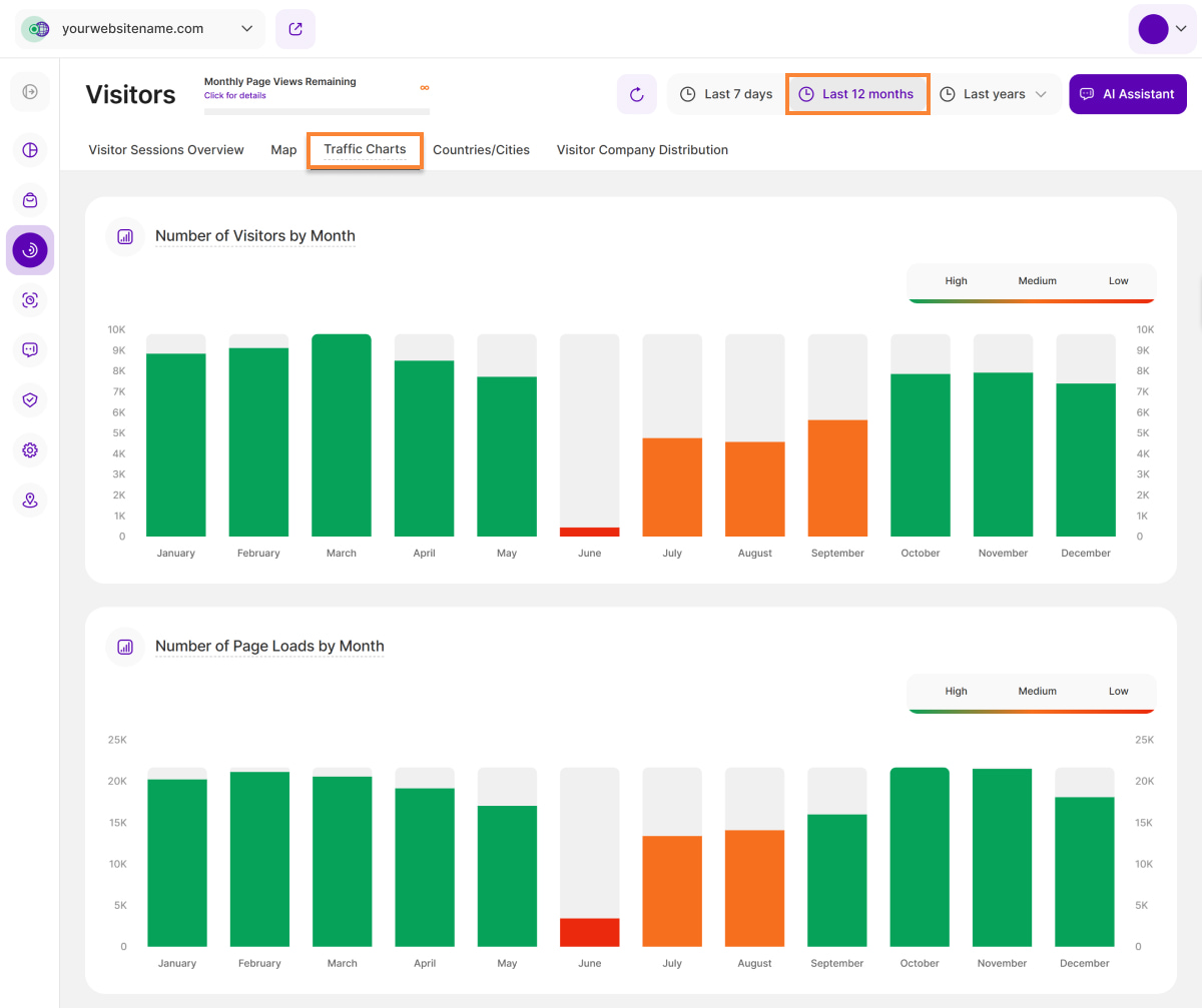 - Number of Page Loads by Month: Shows the number of page views your website had monthly in the past year. This supports the data of the graph "Number of Visitors by Month".