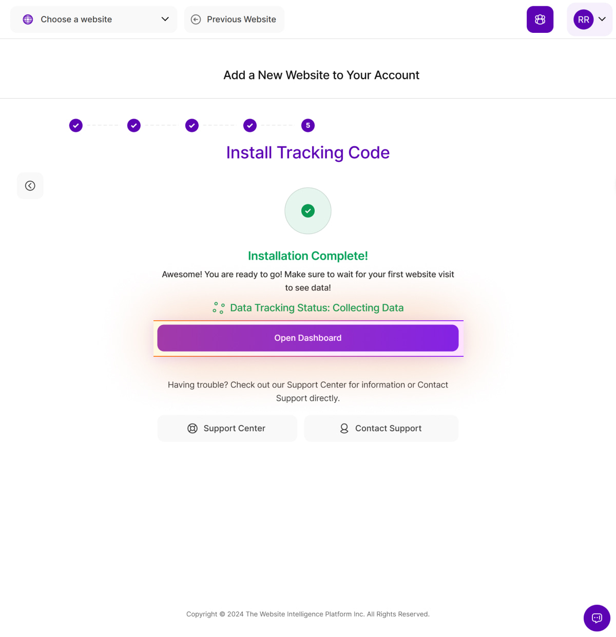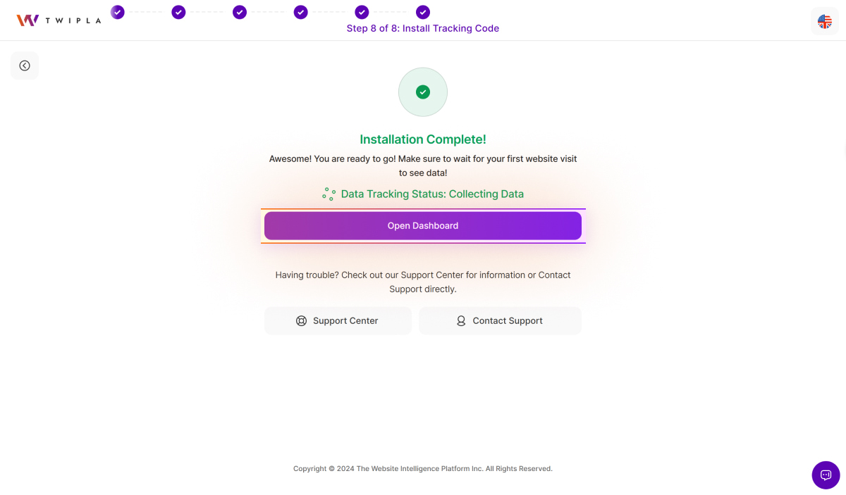15. Click Open Dashboard to access the Main Dashboards. You can visit your live website to verify the collection of website visits to the platform and reload the dashboard to see your initial statistics.
