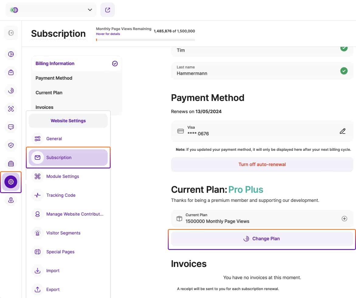 Hint: Once updated, the new plan will come into effect at the end of the current payment cycle. Only pay the subscription that matches your traffic volume, and use all tools to maximize the insight potency.