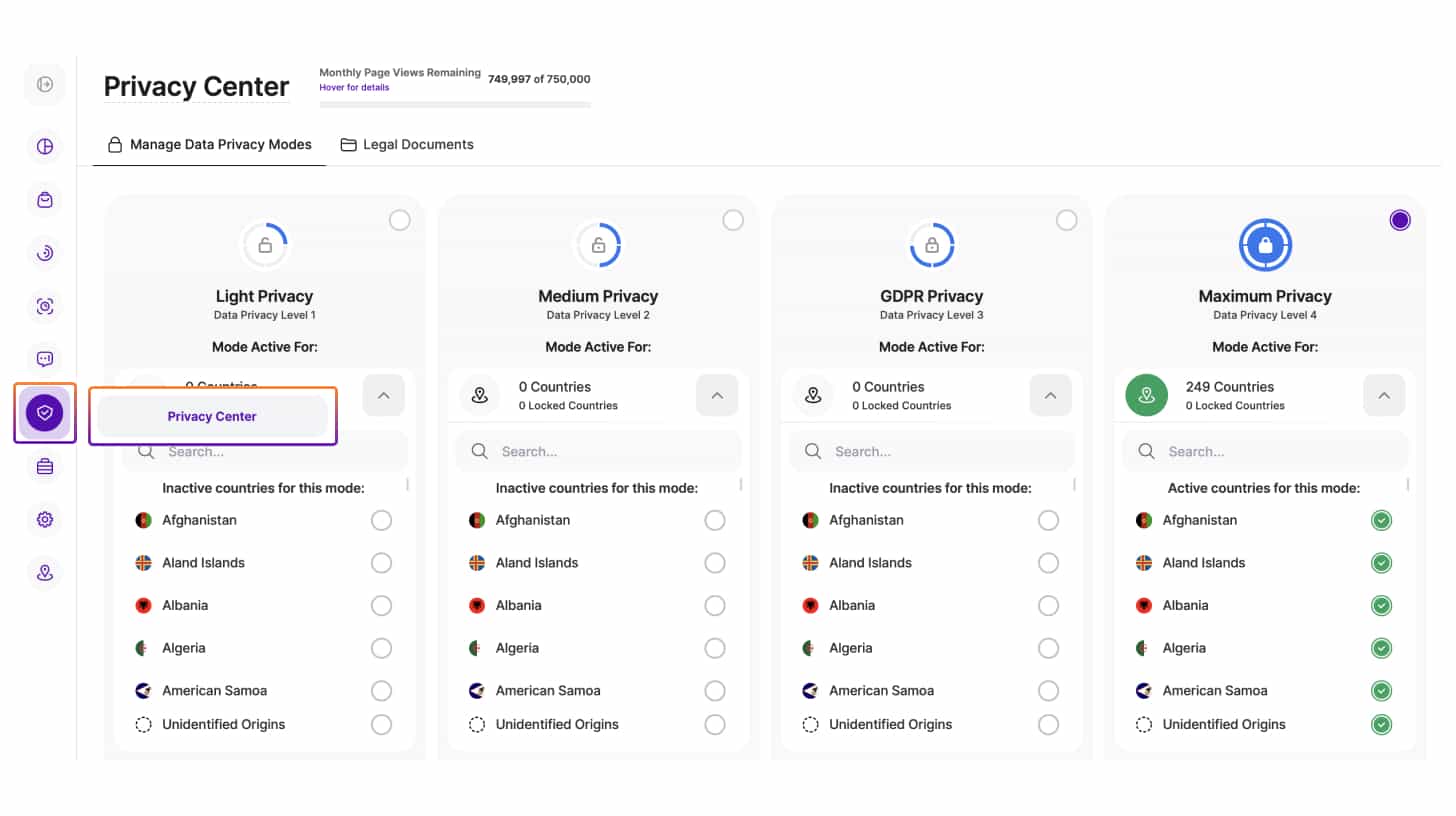 Note: The privacy modes have been named to make it easy to identify the compliance thresholds met by each. You can set a different mode for each country of origin to maximize data capture within the limits set by laws local to website visitors, and can do this in the Privacy Center.