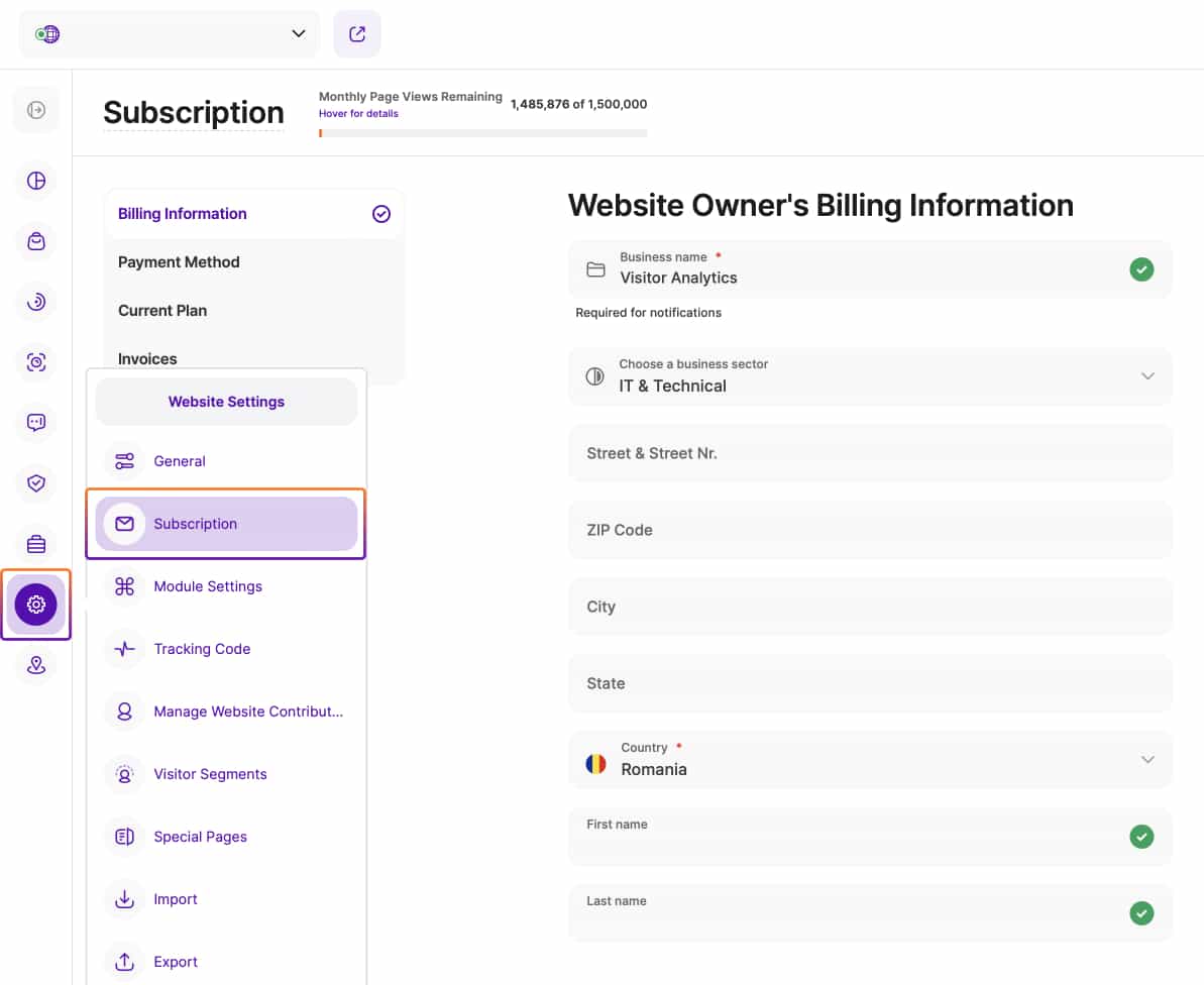 - Go to Website Settings in the left-hand vertical icon menu and click on Subscription.
