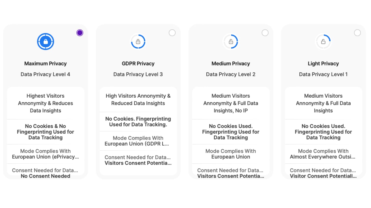 You'll now be asked to select the platform-wide privacy mode from four options. Choose Maximum Privacy Mode and meet all global requirements without any additional legal responsibilities. Alternatively, choose a lower privacy mode, adopt the necessary compliance measures, and legitimately collect deeper visitor-by-visitor datasets.