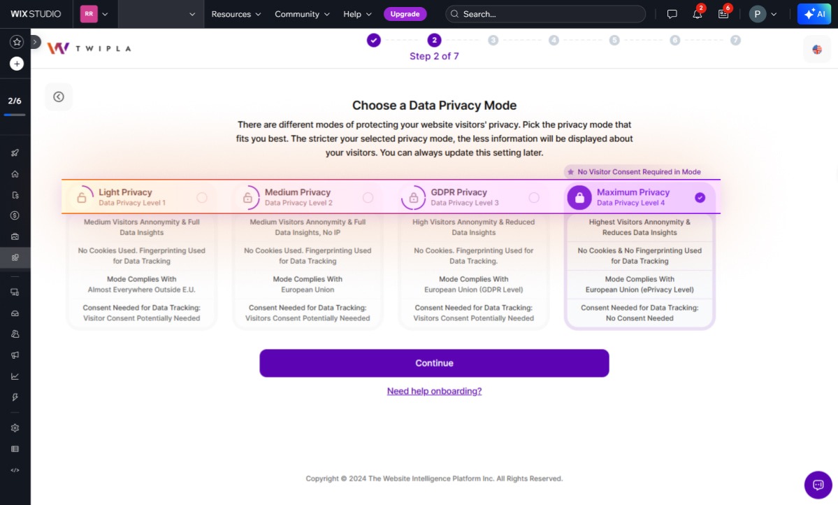 7. Selectați modul preferat de confidențialitate a datelor. În mod implicit, modul de confidențialitate a datelor este setat la Confidențialitate maximă. Dacă doriți să îl modificați, selectați un alt mod de confidențialitate utilizând butonul radio și apoi faceți clic pe Continuați. Pur și simplu faceți clic pe Continuați pentru a continua cu setarea implicită.